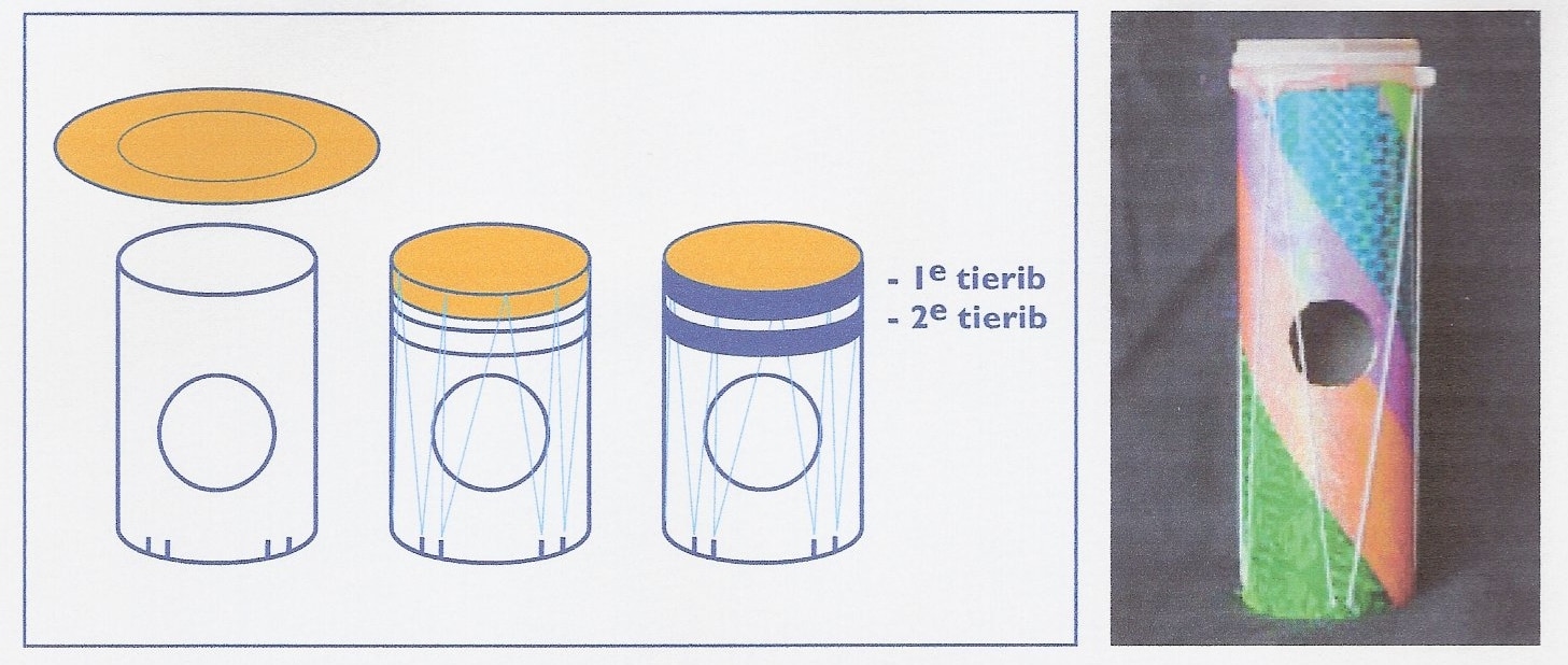 *Voor het trommelvel heb je verschillende opties. Een echte huid geeft de meest authentieke klank, maar kan duur zijn. Alternatieven zijn dikkere folie, plakband (kruisgewijs opplakken) of ballonnen waarvan je het tuitje afknipt.